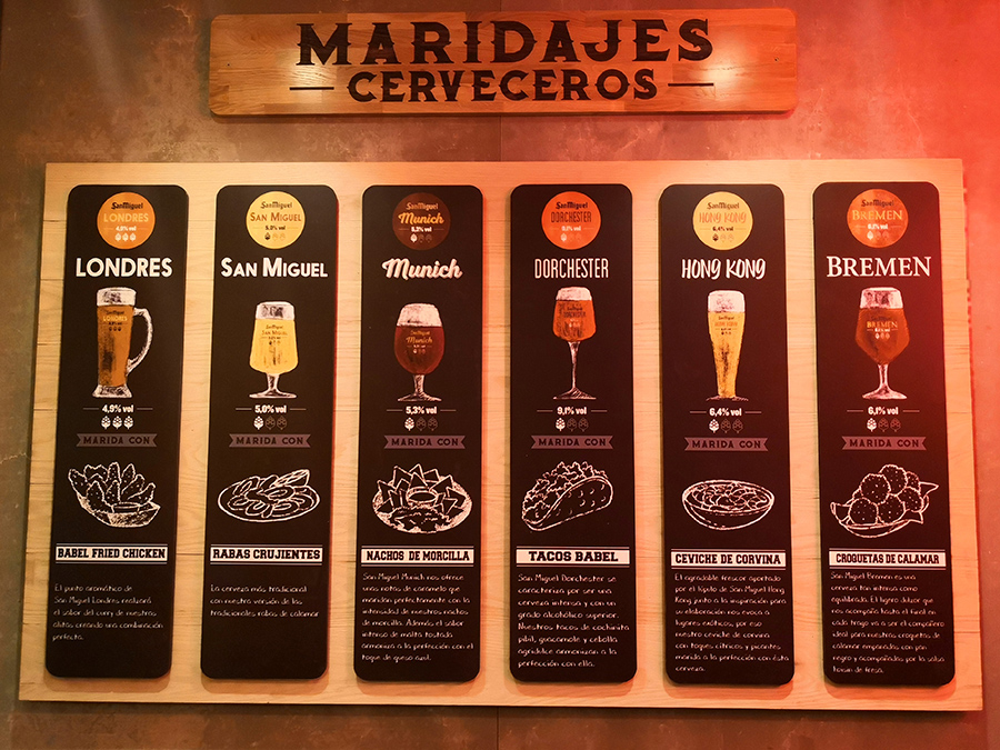 En el año 2019 formamos parte del equipo que llevo a cabo el proyecto decorativo realizado por el estudio KURVA para Babel Palencia. Una de las señas de identidad de Babel Palencia es la presencia de una Tap Station de Cervezas San Miguel, por este motivo se realizaron un gran numero de elementos decorativos e informativos que ayudasen a los clientes a reconocer las sutiles diferencias entre las cervezas disponibles en el restaurante y sus recomendaciones de maridaje con algunos de los platos destacados del mismo.