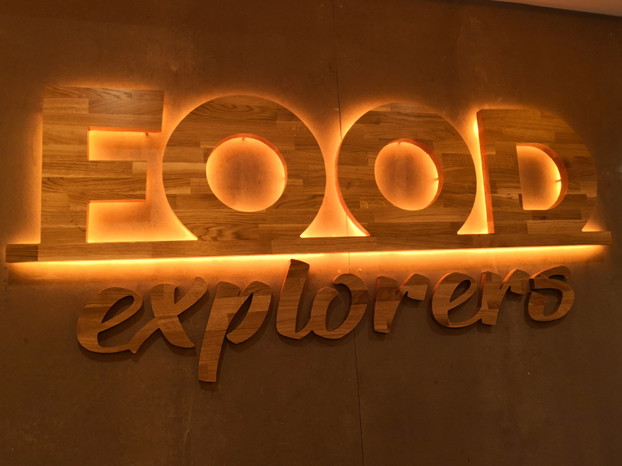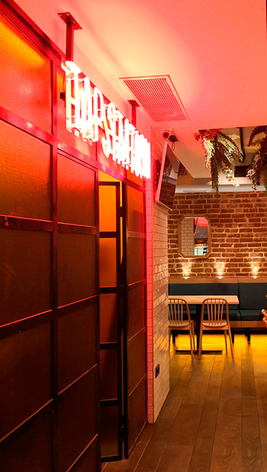 Se realizaron los rótulos en madera, retroiliminando el principal para conseguir un efecto «halo»