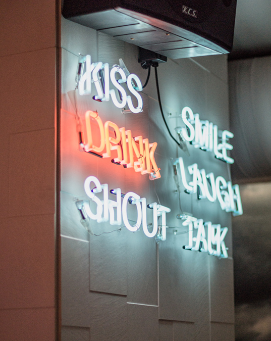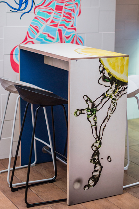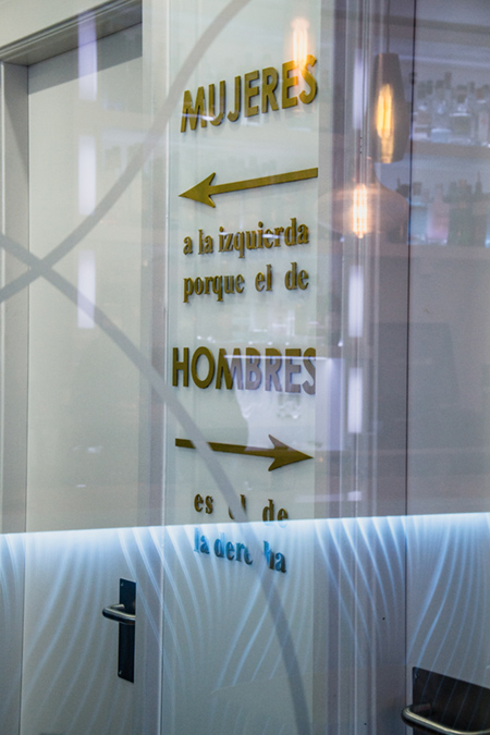 Destaca en la fachada el rótulo de acero corten con elementos tipo hojas, así como la mesa realizada a juego. Del interior se aprecia en un primer momento las mesas decoradas mediante impresión directa UV, así como los vinilos, neones, señalética realizada en madera, etc.