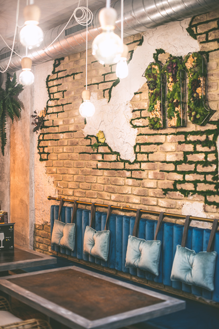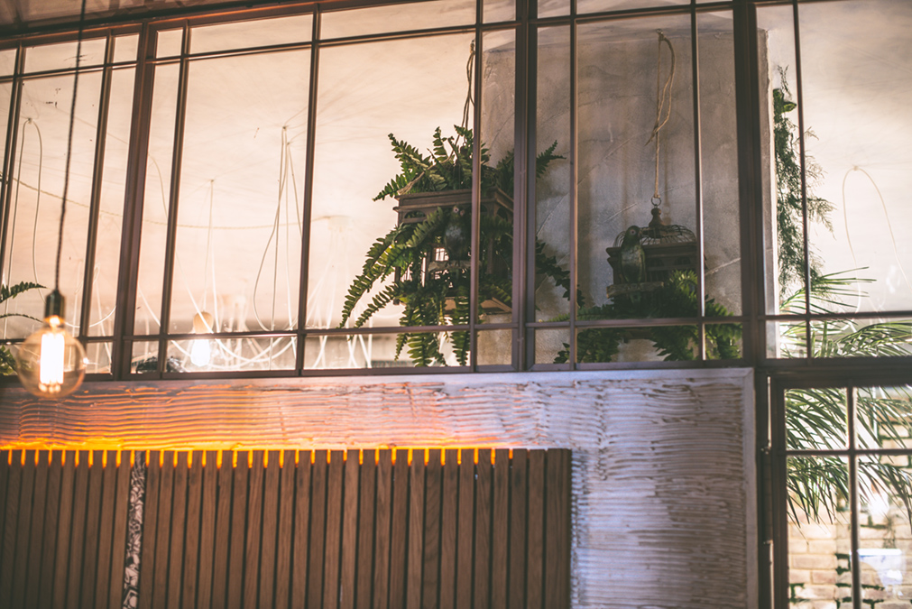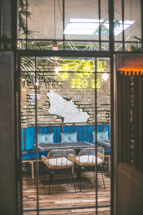 Realizamos diversos trabajos para la reforma proyectada por Creación de Espacios en la Cervecería Pio 12, entre ellos destaca la carpintería metálica en estilo industrial que cierra toda la zona y cuenta con una puerta de acero integrada en el mismo estilo, dividiendo el comedor de esta terraza interior. También se realizaron las mesas.