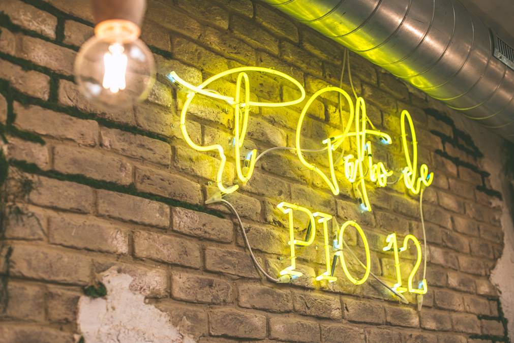 De los trabajos de imagen resulta especialmente llamativo el neón de “El Patio de PIO 12” y también le dimos una vuelta de tuerca a la “M” de Mahou, creando una letra corpórea que quedase integrada en el espacio.